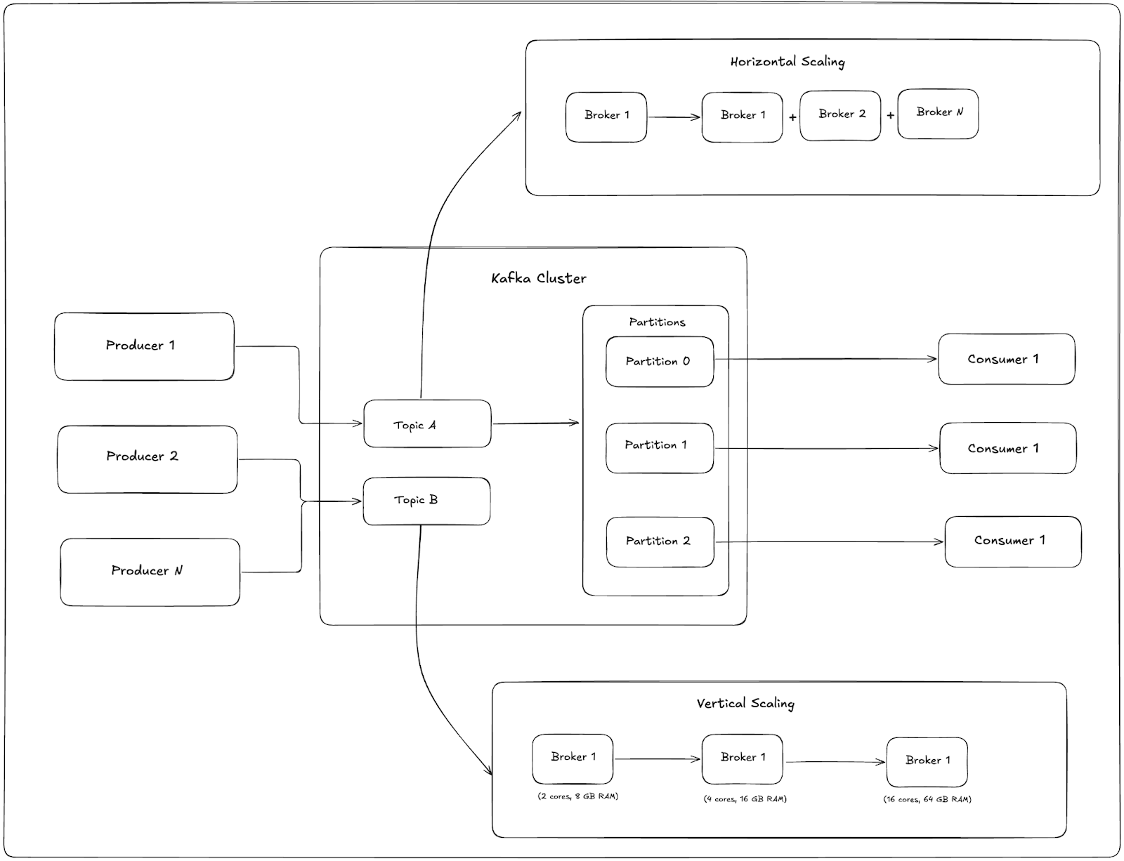 For example, vertical scaling can help in the short term when hardware resources are the limiting factor but physical limits are reached quickly. Horizontal scaling, on the other hand, aligns more closely with Kafka’s distributed architecture and leverages concepts such as Kafka partition strategy to distribute load effectively.