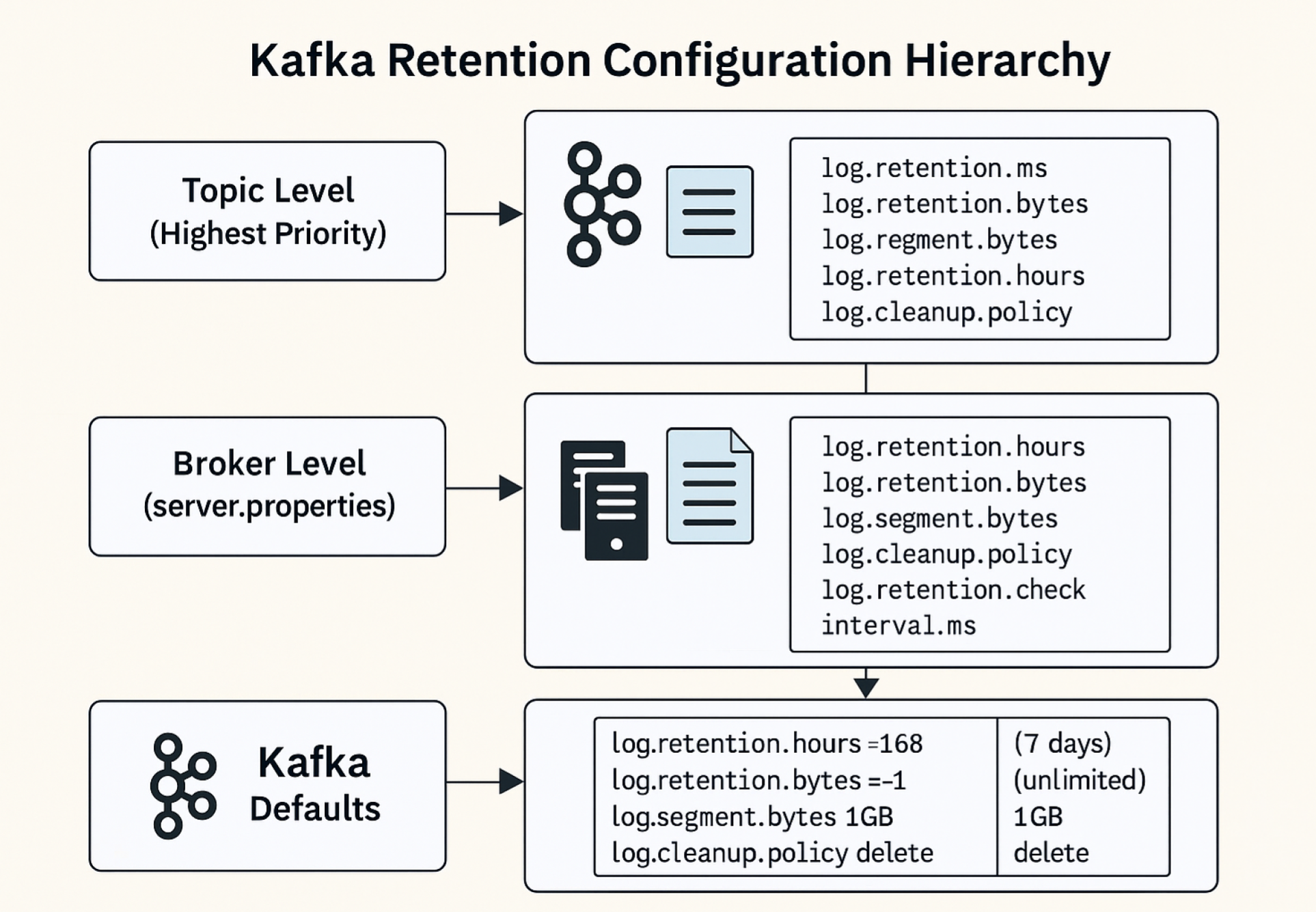 Proper Kafka retention configuration requires understanding the hierarchy of settings and how to apply policies at different levels. Kafka provides flexible retention mechanisms through time-based and size-based policies that can be configured globally or per topic.