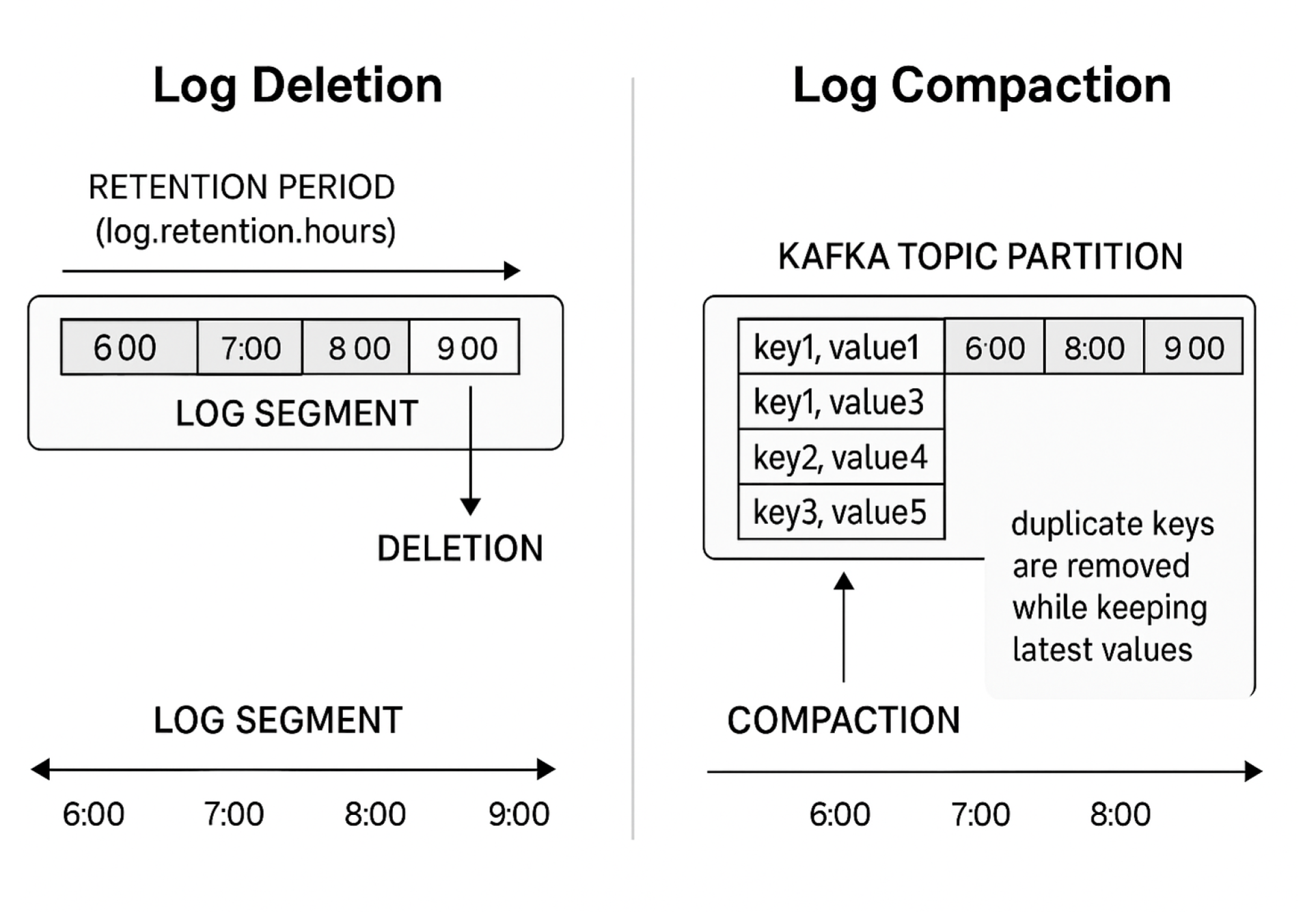 Log deletion removes entire segments once retention limits are reached. Log compaction retains only the most recent record per key, ensuring stateful data like user profiles is always available.