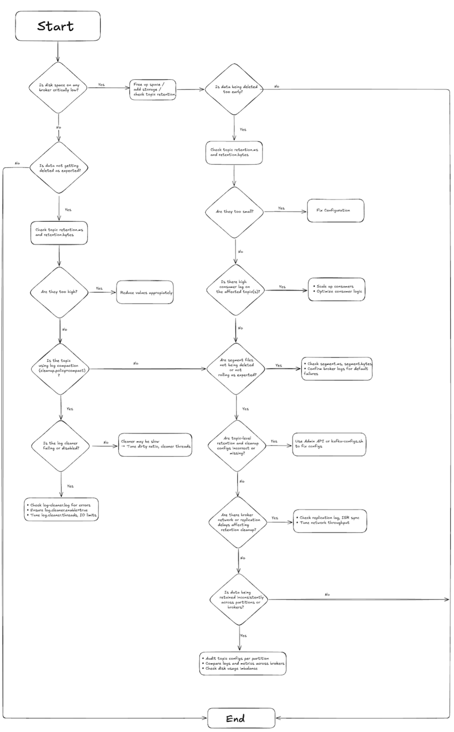 Kafka’s log retention relies on background cleanup processes that must be monitored to ensure they’re functioning properly. Use metrics like: