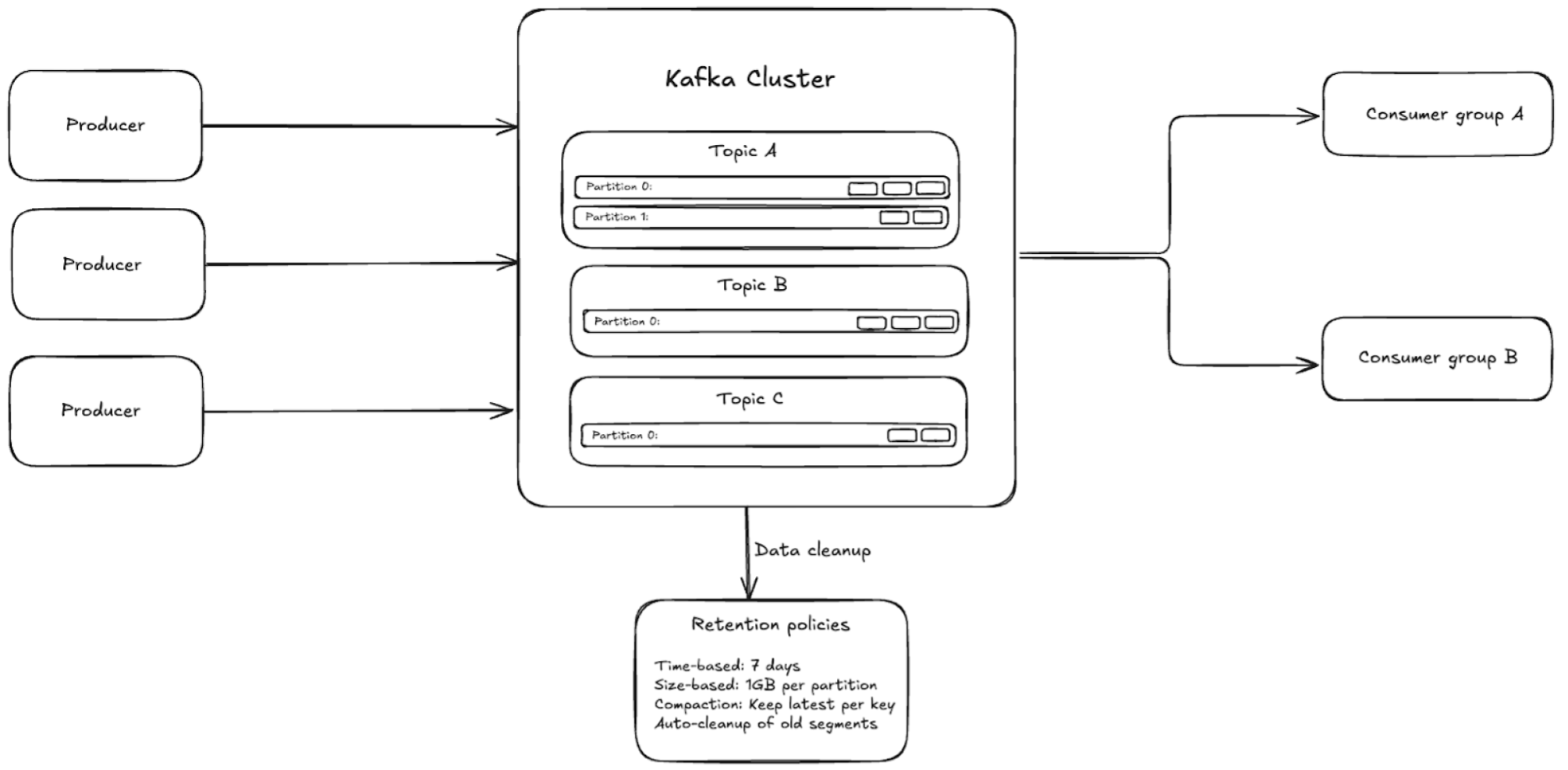 Apache Kafka is a distributed streaming platform designed for high-throughput, fault-tolerant event processing. That’s what makes Kafka retention such a fundamental concept for developers to understand and apply—how long you choose to store messages in a topic before deleting or compacting them directly impacts the data availability and system health of applications you build with Kafka.