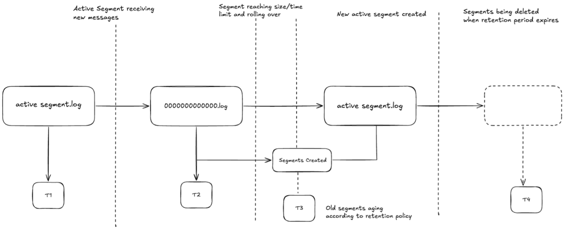 log.retention.hours – Specifies the duration (in hours) that messages are retained. Default: 168 hours (7 days)