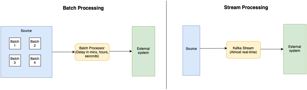 In contrast, Kafka Streams takes an approach to stream processing that the data is taken from the source systems directly without converting them into batches. The processing on such systems is done in real time.